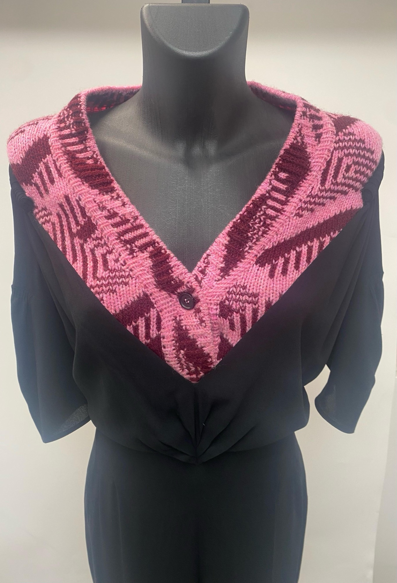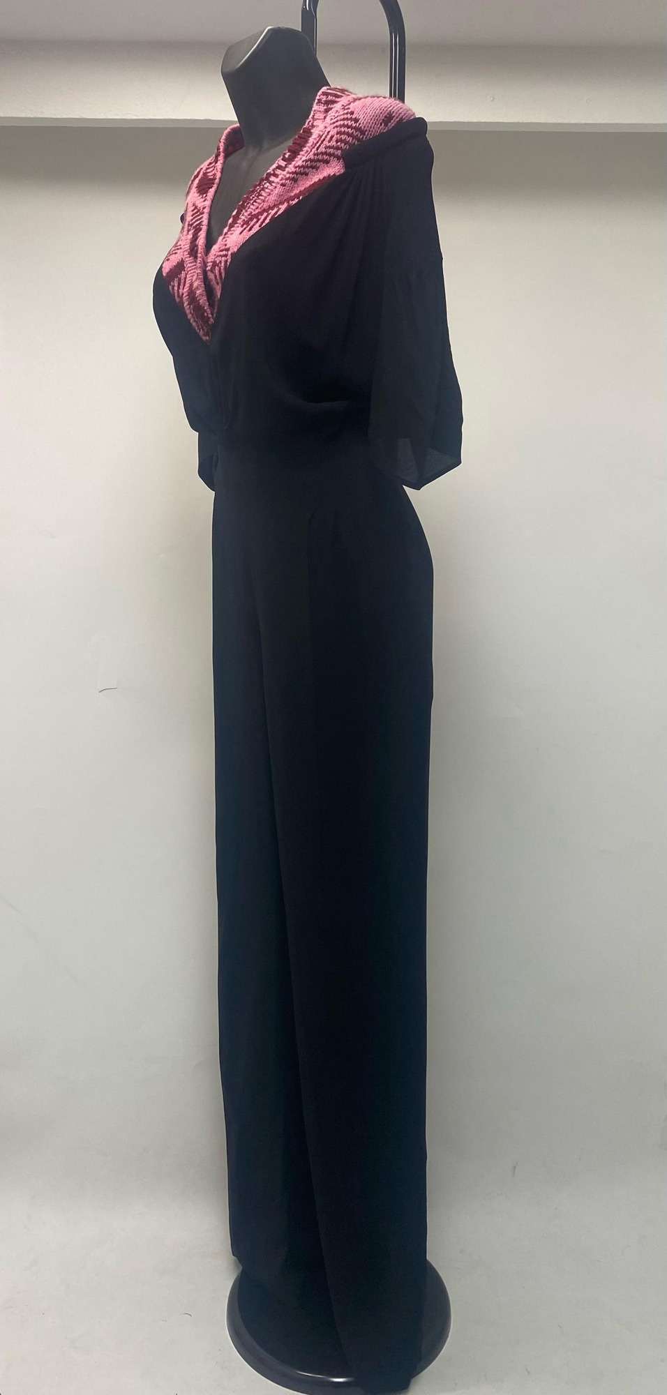 Prada short-sleeved black synthetic jumpsuit, embellished with a pink wool yoke in the collar and at the back.